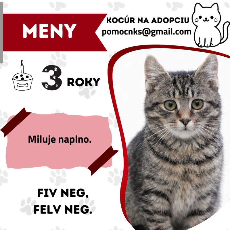 Povaha: Meny je nádherný tigrovaný kocúr. K ľuďom si dôveru buduje pomaly, no keď si niekoho zamiluje, miluje ho naplno. Je to veselý, mladý gentleman – pozorný k mačičkám a obzvlášť galantný k ženám.