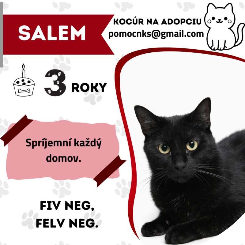 Povaha: Salem je pokojný a nádherný čierny kocúr. Má veľmi rád mačky aj iných kocúrikov. Je nenápadný, nenáročný a verný spoločník, ktorý v tichosti spríjemní každý domov.
