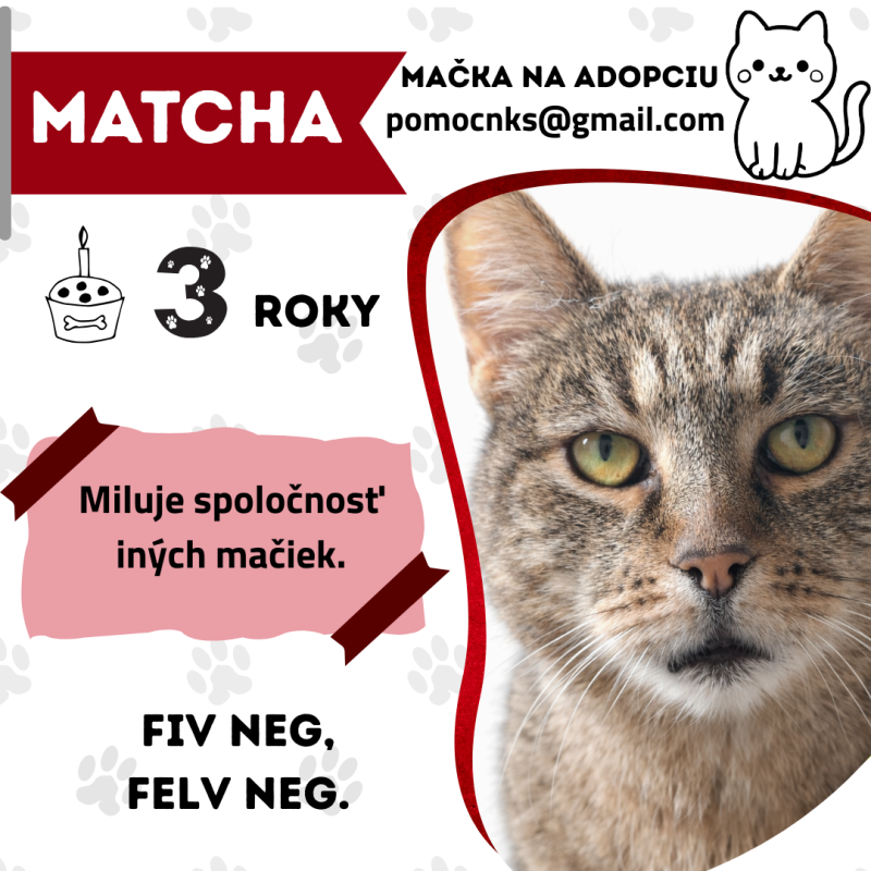 Matcha je plachá a nekontaktná – dotyky jej nie sú príjemné a vzťah s človekom si buduje veľmi pomaly. S trpezlivosťou a rešpektom si však dokáže vytvoriť puto, najmä ak ju viete „podplatiť“ dobrým jedlom. 😺