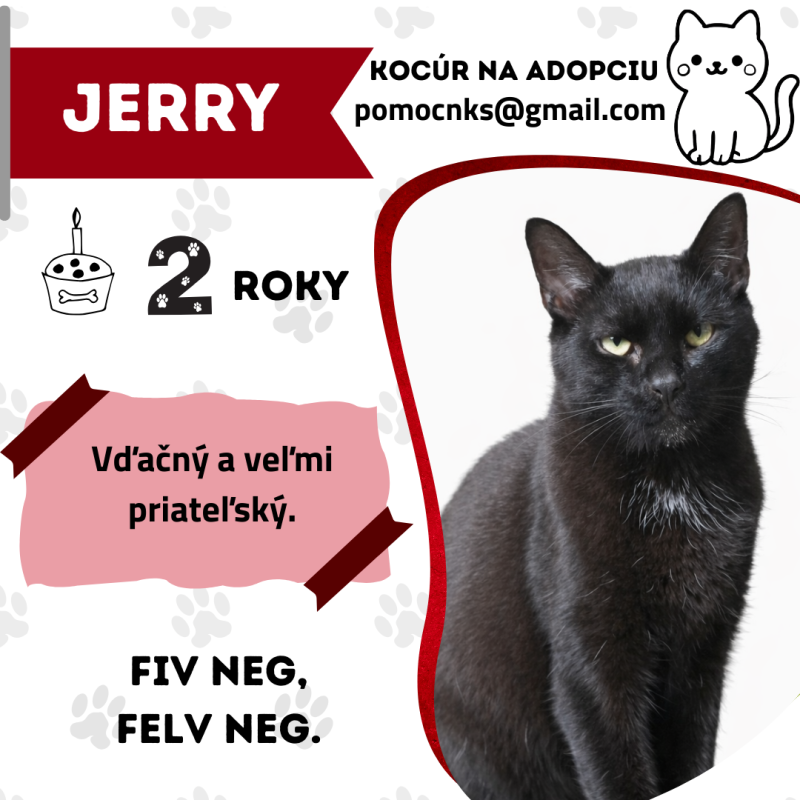Povaha: Jerry sa dlhý čas potuloval po uliciach. Jeho prítulná povaha bola rizikom, že mu niekto ublíži, preto sme ho prijali k sebe. Od prvého dňa sa správa, akoby tu bol odjakživa. Má rád spoločnosť mačiek, nepohrdne hladkaním a miluje hranie sa s vodou aj svoje granulky. Je to spokojný, vďačný a veľmi priateľský kocúr.