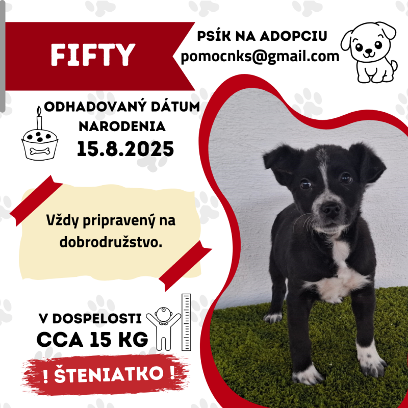 Fifty je mladý psík, ešte len šteniatko, ktoré miluje ľudí celým svojím srdcom. Je veľmi kontaktný, priateľský, hravý a vždy pripravený na ďalšie dobrodružstvo. Jeho príbeh je však smutný. Zachránili sme ho od mladej dievčiny, ktorá žobrala pred obchodom. Bol v katastrofálnom stave a bolo isté, že by bez pomoci nedožil viac než pár dní.