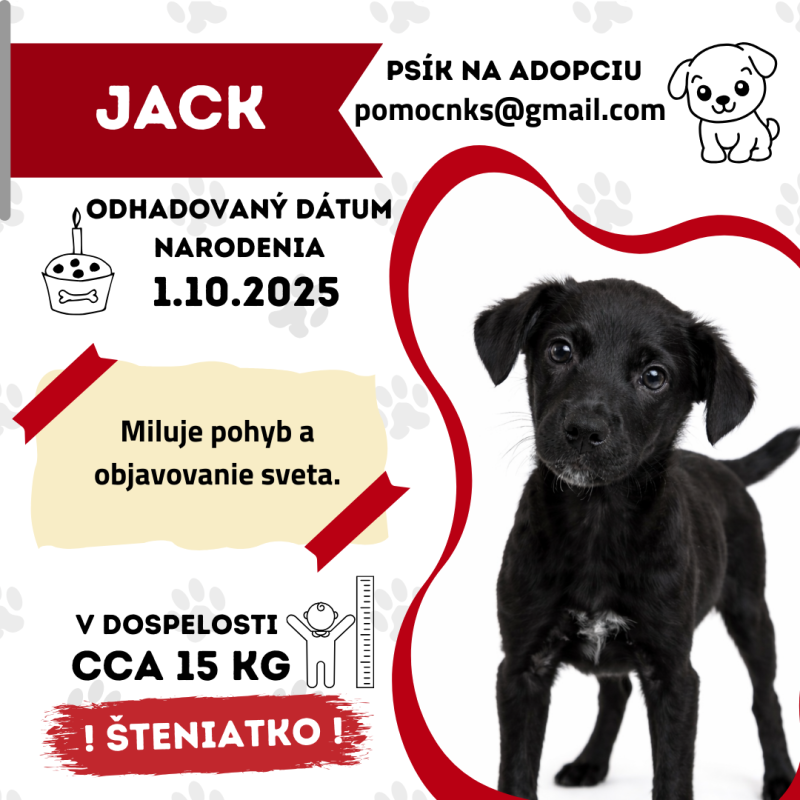 Jack je veselé a veľmi aktívne šteniatko, ktoré miluje pohyb a objavovanie sveta. Neustále má chuť behať, hrať sa a učiť nové veci. Vďaka svojej povahe bude ideálnym parťákom na športové aktivity, dlhé prechádzky či výlety do prírody.