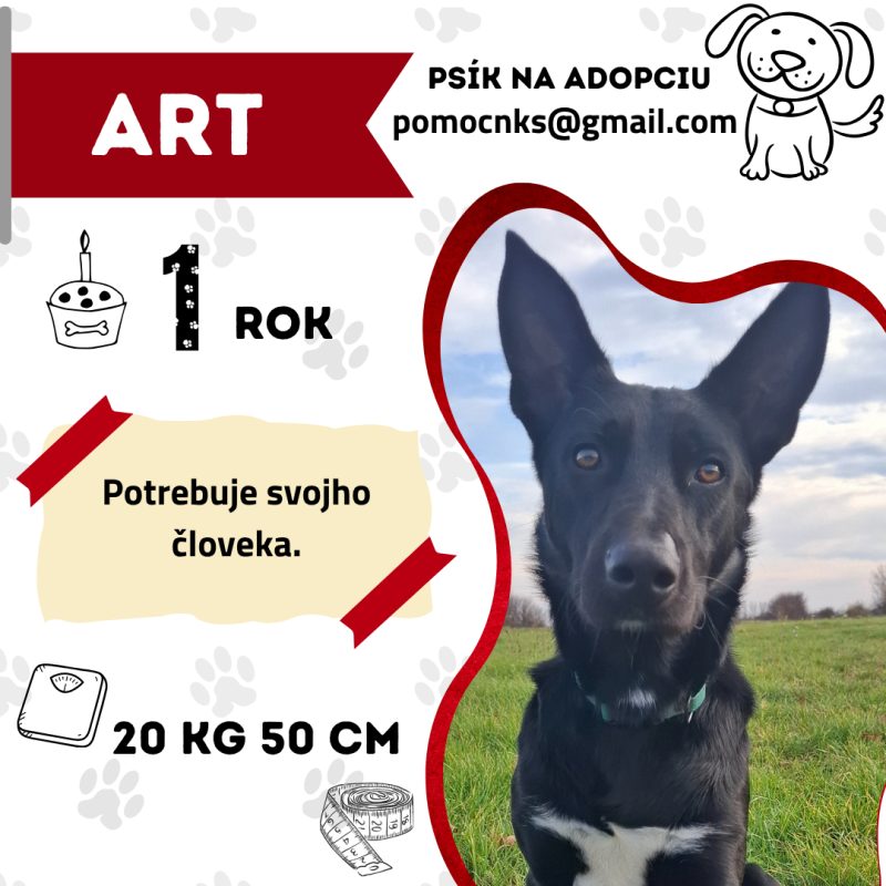Art je tak trochu ako tínedžer, ktorý sa ocitol v chaose sveta bez návodu na prežitie. Má obrovský potenciál, krásnu dušu a túžbu milovať… len zatiaľ nevie, ako na to. Vrátil sa z adopcie, lebo samota ho ničí. Nie je to pes na chvíľu po práci . Je to pes na spoločný život.