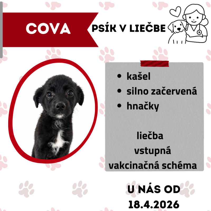Covu sme spolu s jej súrodencami prevzali z iného združenia. Pochádza z odchytu v osade. Všetci museli absolvovať liečbu, mali silné hnačky, boli silno začervené a trápil ich aj kašeľ. Momentálne sa ich zdravotný stav výrazne zlepšil a po absolvovaní všetkých očkovaní im budeme hľadať nové rodiny.