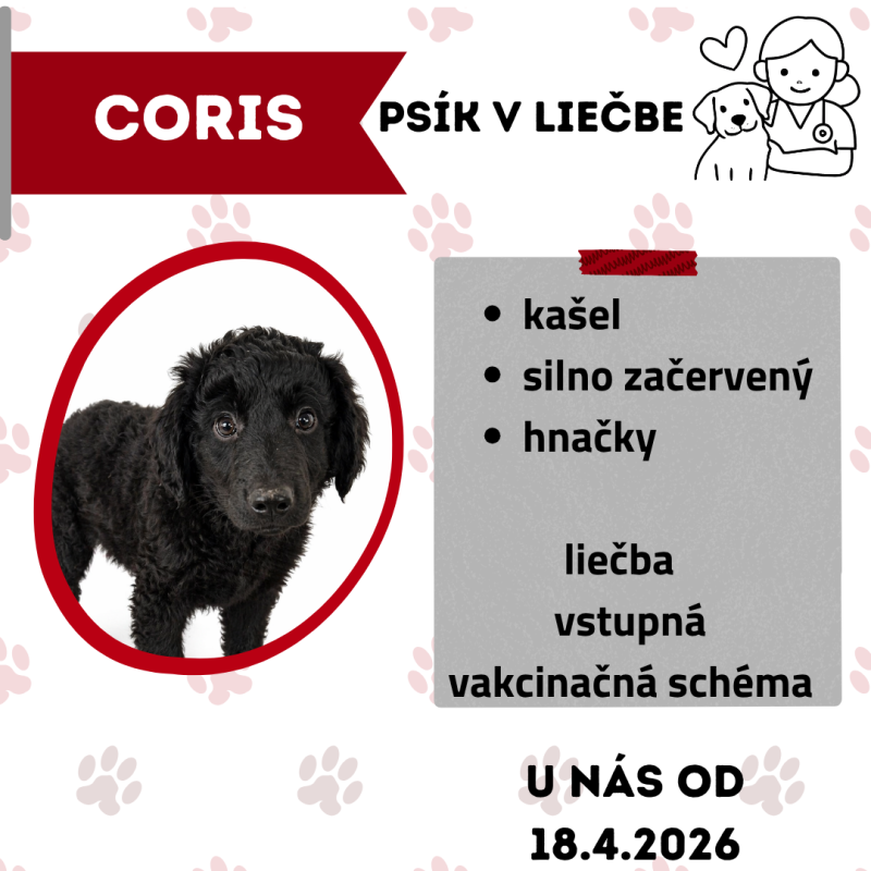 Corisa sme spolu s jeho súrodencami prevzali z iného združenia. Pochádza z odchytu v osade. Všetci museli absolvovať liečbu, mali silné hnačky, boli silno začervené a trápil ich aj kašeľ. Momentálne sa ich zdravotný stav výrazne zlepšil a po absolvovaní všetkých očkovaní im budeme hľadať nové rodiny.